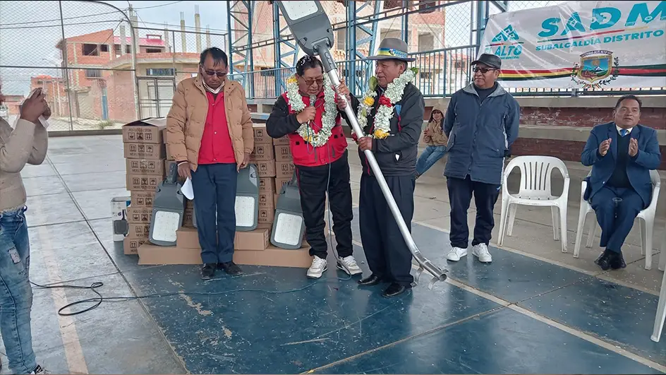 Con una inversión que supera los Bs 200 mil, este martes los vecinos de la urbanización Cosmos 79, del Distrito 3, recibieron de manos del subalcalde Lorenzo Quispe un total de 83 modernas luminarias LED, destinadas a mejorar el alumbrado público y fortalecer la seguridad ciudadana en la zona.