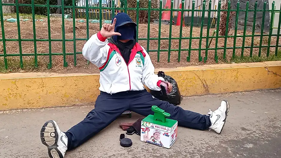Con su chamarra con el logo “Libre” de color blanco, su pasamontaña característico de su oficio, mostrando su habilidad con los cepillos y la crema para zapatos, pero, sobre todo, con su caja con las imágenes de “Tuto Presidente y JP Vicepresidente”, el lustracachos alteño afirmó que su sector considera que Quiroga es el único que puede sacar al país de la crisis.