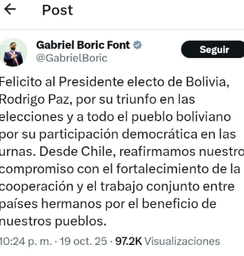 "Felicito al Presidente electo de Bolivia, Rodrigo Paz, por su triunfo en las elecciones y a todo el pueblo boliviano por su participación democrática en las urnas. Desde Chile, reafirmamos nuestro compromiso con el fortalecimiento de la cooperación y el trabajo conjunto entre países hermanos por el beneficio de nuestros pueblos."